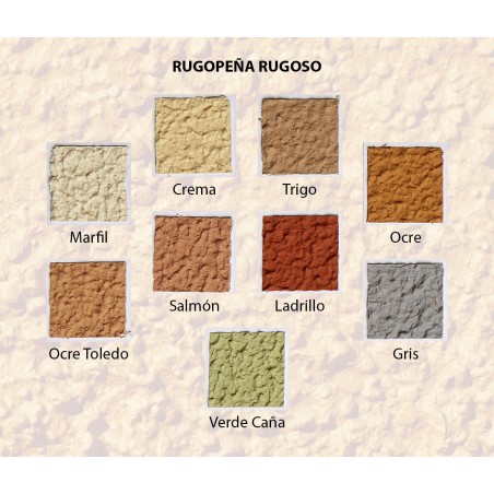 RUGOPEÑA RUGOSO es un revestimiento texturado impermeabilizante de alta calidad, formulado a base de emulsiones copolímeras acuosas idóneas, cargas minerales especialmente seleccionadas y pigmentos adecuados para la obtención de una extensa gama de colores que confieren al revestimiento una alta resistencia al álcali, ácidos y ataques ambientales. El revestimiento rugoso RUGOPEÑA, evita en parte, ruidos y temperaturas ambientales extremas por la capacidad de aplicarse en elevados grosores. El revestimiento RUGOPEÑA es perfecto para fachadas, ya que entre otras evita las humedades, al mismo tiempo que decora por su buen acabado sobre cemento, hormigón, yeso, etc.